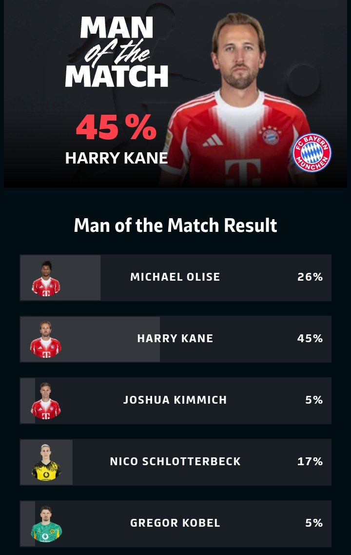 今天凌晨德甲第7轮那场球,拜仁在主场2-1把多特给收拾了,凯恩那场可是从头打到尾,赛后一统计,他靠着45%的得票率,直接拿了这场比赛的最佳球员。凯恩这场是首发,从头到尾都没下场,第22分钟就进了个球,帮球队先领先了。而且啊,他12次长传成功了11次,11次地面对抗赢了8次,这表现,杠杠的。赛后一投票,他45%的得票率直接拿了最佳,排第二的是奥利塞,26%,第三的是施洛特贝克,17%,基米希和科贝尔